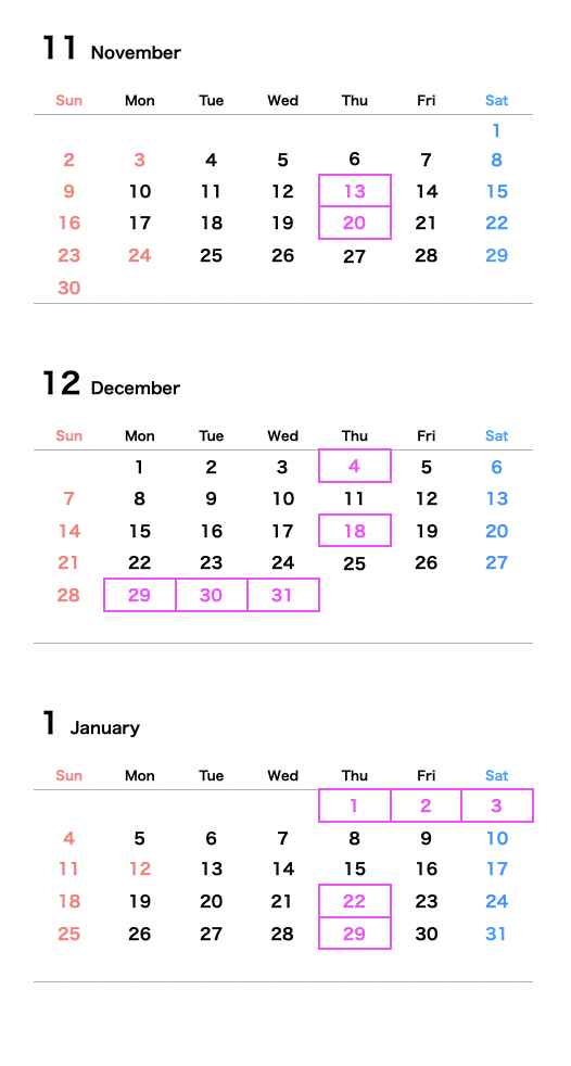 11月,12月,1月休診のお知らせ 2025.10.29 誠に勝手ながら、 11/13(木),11/20(木), 12/4(木),12/18(木),12/29(月)〜1/4(日)1/22(木),1/29(木)が休診となります。 ご迷惑をおかけして申し訳ありませんが、どうぞよろしくお願いいたします。 城南レディスクリニック品川院長